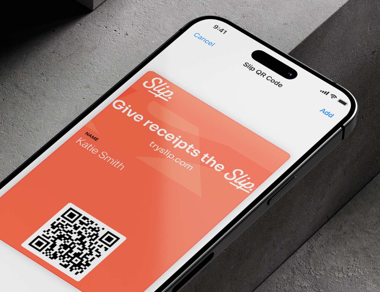 The user can add their QR code to the Apple Pay and Google Wallet apps as a unique Slip card.